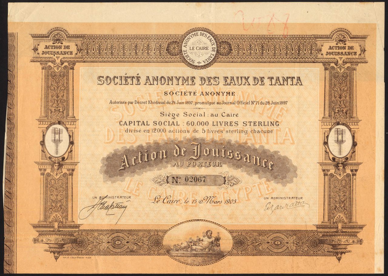 A-35566Société Anonyme des Eaux de Tanta-1Egitto1905Jouissance shareR2 (1001-5000 pezzi)S3 (da 51 a 100 €)