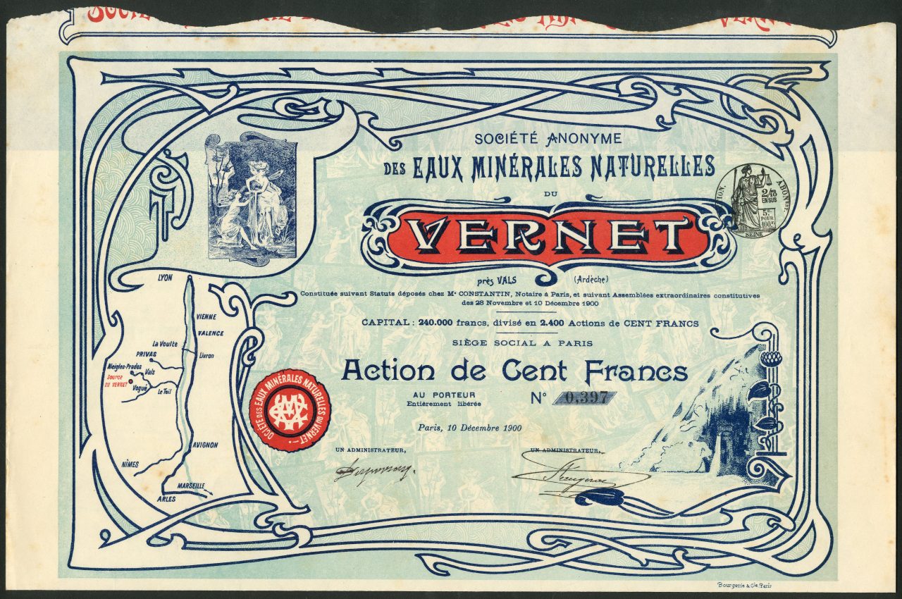 A-36231Des Eaux Minérales Naturelles de Vernet soc. an.-1Francia1900100 franc shareR2 (1001-5000 pezzi)S3 (da 51 a 100 €)