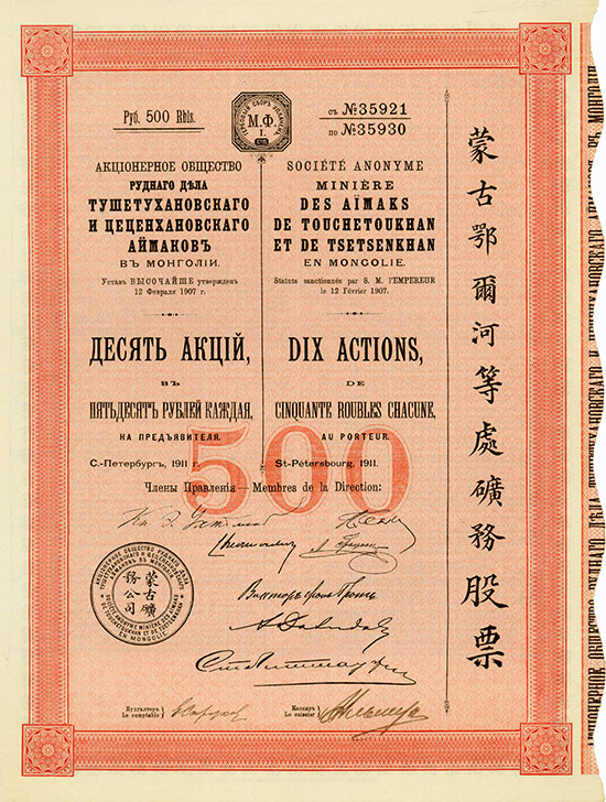 Société Anonyme Miniére des Aimaks de Touchetoukhan et de Tsetsenkhan en Mongolie