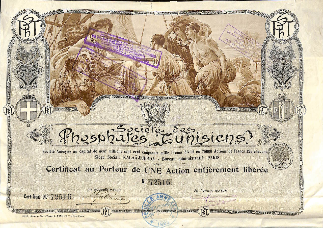 La compagnia mineraria, con sede sociale a Kalaa Djerda in Tunisia e amministrativa a Parigi, fu costituita nel 1904 da un gruppo di uomini d’affari francesi e dalla famiglia toscana Donegani, che apparteneva all’élite imprenditoriale livornese ed era impegnata dalla metà dell’Ottocento in una attività di esportazione e importazione legata al trasporto marittimo. Intensi erano all’inizio del secolo i suoi rapporti con la Banca Commerciale Italiana, con la quale si era particolarmente impegnata in alcune iniziative in campo minerario, come la costituzione della Société des Phosphates Tunisiens per l’acquisto delle miniere di fosfati di Kalaa Djerda in Tunisia. Curiosa segnalazione: le miniere erano site nei pressi di Sfax in Tunisia, la sede amministrativa della società era a Parigi e i titoli furono stampati dall’Officina Carte Valori D. Coen di Torino.