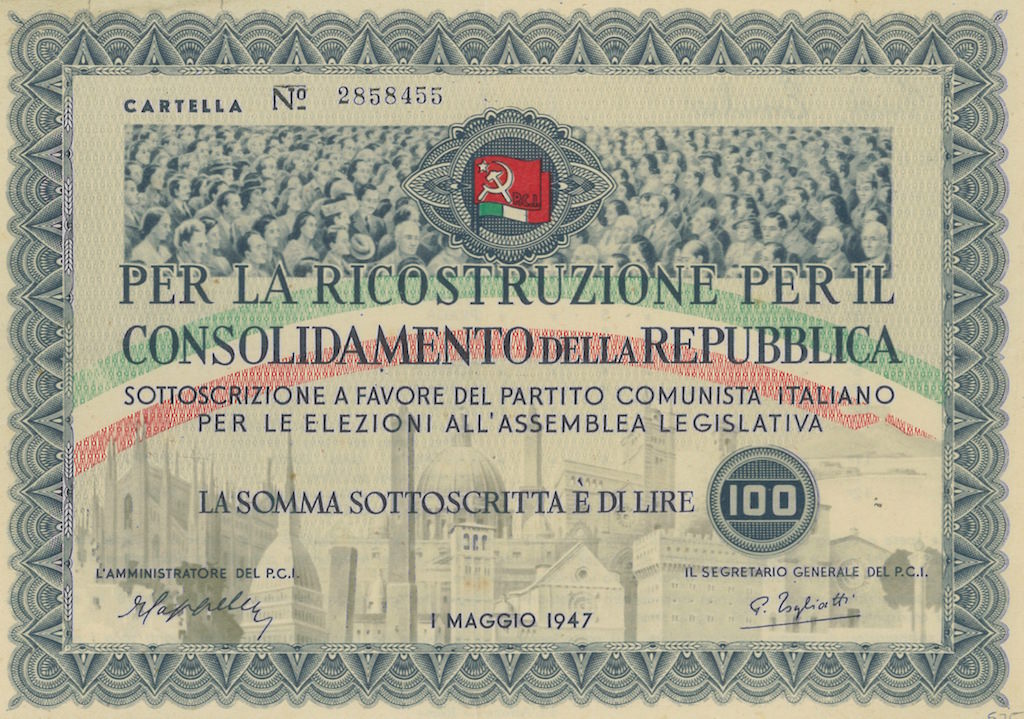 A-1788Sottoscrizione per la Ricostruzione per il Consolidamento della Repubblica-1Calcografia & Cartevalori - MilanoRoma1947Lire 100R3 (501-1000 pezzi)S3 (da 51 a 100 €)