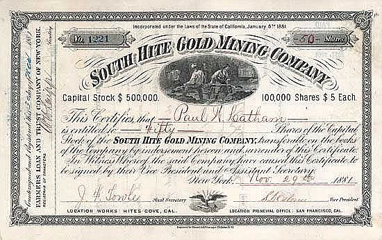 Fondata nel 1881 per gestire una miniera d'oro a Hites Cove, California (16 miglia a nord-est di Mariposa) adiacente alla Hite Mine. Un pozzo profondo 500 piedi è stato costruito e una galleria di esplorazione è stata tagliata ogni 100 piedi, ma non sono stati trovati depositi di minerali estraibili. Questa era una procedura molto comune all'epoca: si cerca il quartiere di una nota miniera il più redditizio possibile e poi si usa il nome illustre per raccogliere capitali per una nuova società.