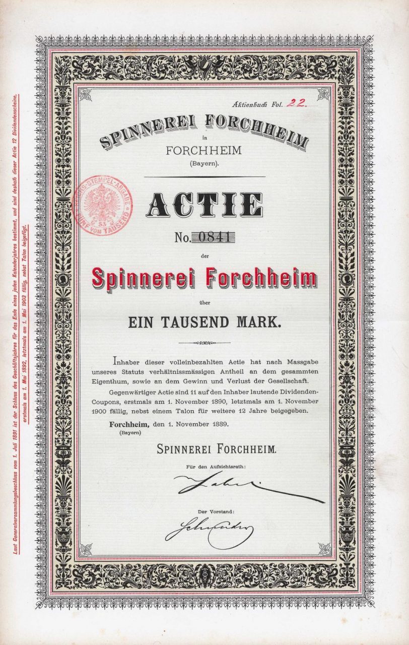 A-64387Spinnerei Forchheim-1Forchheim18891 azione da 1.000 MarchiR5 (101-250 pezzi)S5 (da 251 a 500 €)