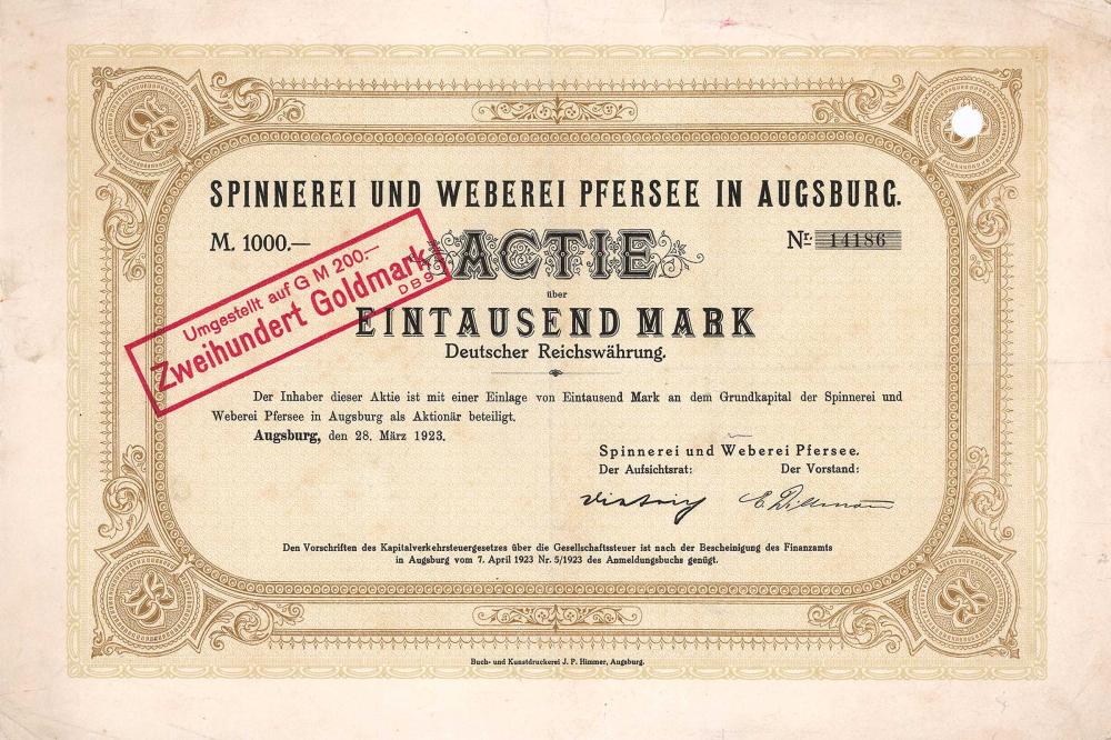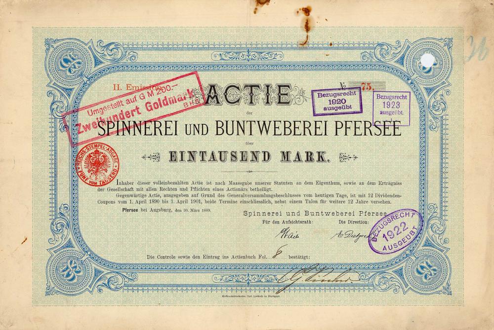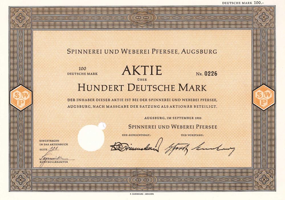 Fondata nel 1881 come filanda e tessitura di Pfersee. Aveva fabbriche a Pfersee (filatura e tessitura), Ay (2 filatura, 1 tessitura), Gerlenhofen (filatura), Zöschlingsweiler (tessitura) ed Echenbrunn (tessitura). Era una delle più importanti aziende tessili di Augusta. Nel 1987, il principale azionista comune (Bayerische Vereinsbank) ha unito la perla dei guadagni Pfersee con la società madre malata Spinnerei Kolbermoor AG per diventare Pfersee-Kolbermoor AG. Dopo che la maggior parte delle azioni è stata venduta al gruppo di servizi Wisser con sede a Francoforte, la loro produzione tessile è stata completamente interrotta nel 1993 e Pfersee-Kolbermoor AG è stata convertita in una holding per attività tessili, di servizio e immobiliari. Oggi Pfersee-Kolberm... Altro