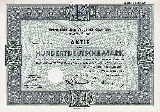 L’azienda è stata fondata nel 1852 come “Filatura meccanica e tessitura di cotone Kempten” e ribattezzata “Spinnerei und Weaving Mill Kempten” il 4 maggio 1938. L’azienda si trova nella valle dell’Iller, che in questo punto è profondamente tagliata, e lo stabilimento si è avvalso della sua energia idroelettrica. Questa posizione nella valle profonda, quasi invisibile agli aeroplani – alla fine solo due capannoni furono davvero distrutti – fu il motivo per cui la Wehrmacht confiscò la fabbrica nel 1942 per i propri scopi. I danni ai locali di lavoro e alle macchine di produzione causati dall’appropriazione indebita furono il motivo per cui la produzione riprese solo nel dicembre 1946, oltre un anno dopo che era stato concesso il permesso di avviamento, e anche questo solo con esitazione. Nel 1950 fu completata la ricostruzione, nel 1958 fu costruita una nuova centrale idroelettrica. Negli anni ’20, la Kolbermoor Union acquisì la maggioranza delle azioni e successivamente la trasferì alla sua controllata, la Filatura e tessitura Pfersee. Alla fine questo era (quasi) l’unico azionista – a parte 7 azioni in possesso di un monastero che non si poteva persuadere a vendere.