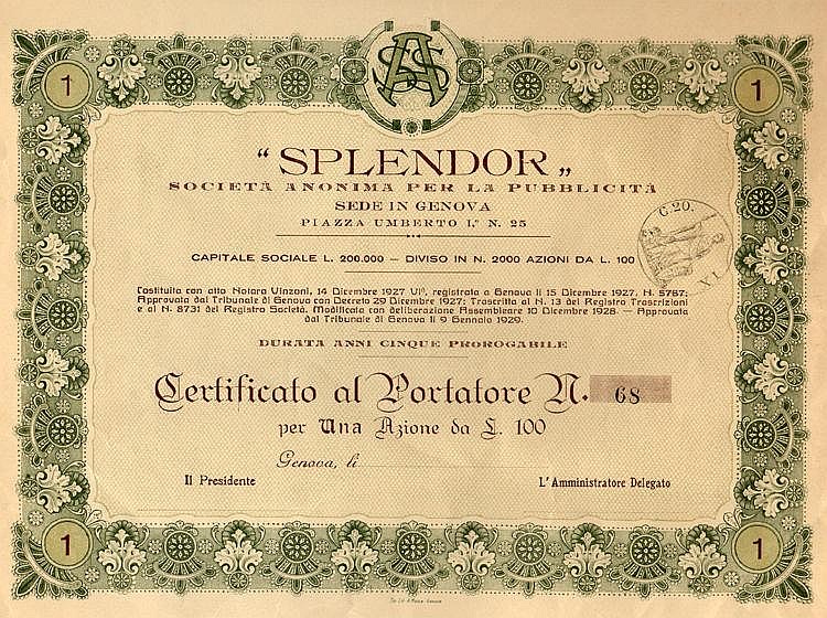 A-49585Splendor S.A. per la Pubblicità-1Genova19291 azione al portatore non emessa da Lire 100R2 (1001-5000 pezzi)S2 (da 26 a 50 €)