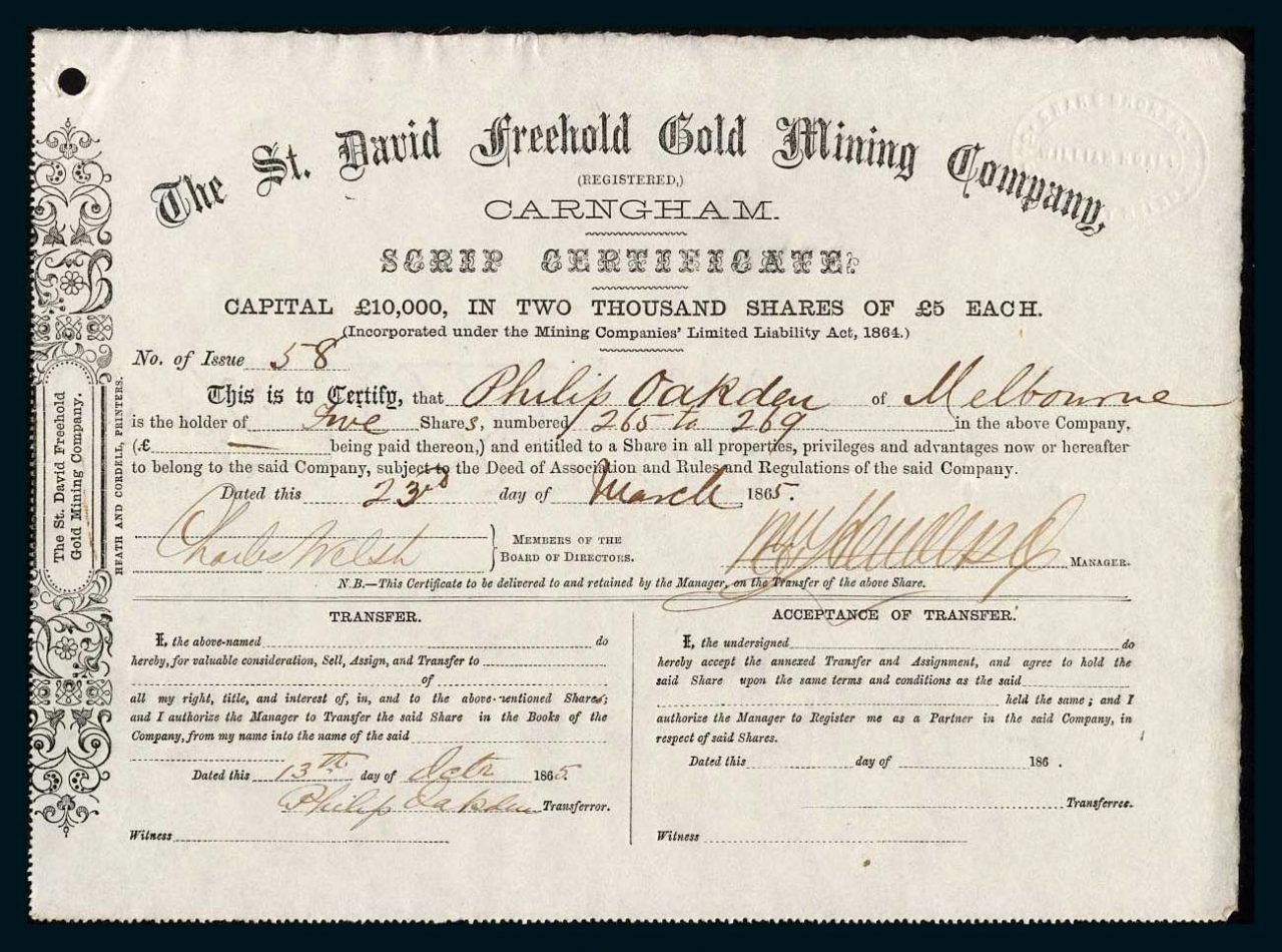 A-33264St. David Freehold Gold Mining Company Reg’d-1Victoria1865£5 SharesR2 (1001-5000 pezzi)S3 (da 51 a 100 €)
