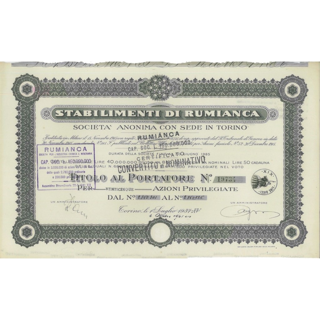 Nel 1936 la “Anonima Stabilimenti di Rumianca” incorpora la “Viset” di Borgaro Torinese (prodotti per l’igiene personale) e la “Società Miniere di Antrona”. Due anni dopo ad Avenza (Mc) nasce lo stabilimento chimico “Rumianca di Apuania”.