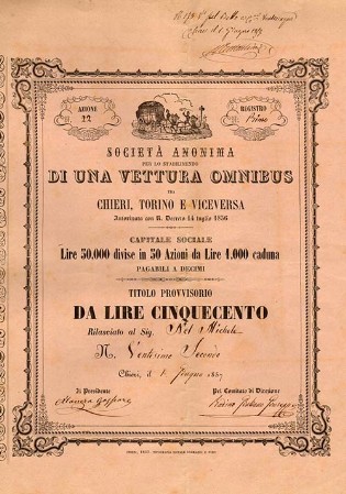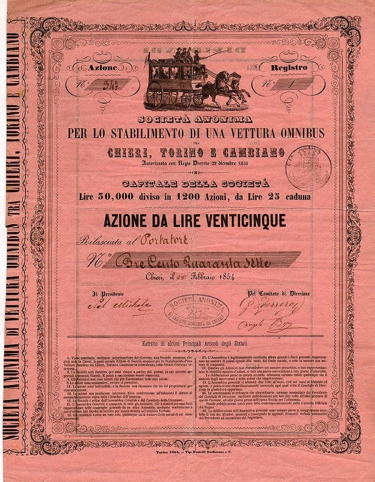 A-35885Stabilimento di una Vettura Omnibus tra Chieri, Torino e viceversa Soc. Anonima-1Chieri18541 azione da Lire 25R8 (11-25 pezzi)S7 (da 1.001 a 1.500 €)