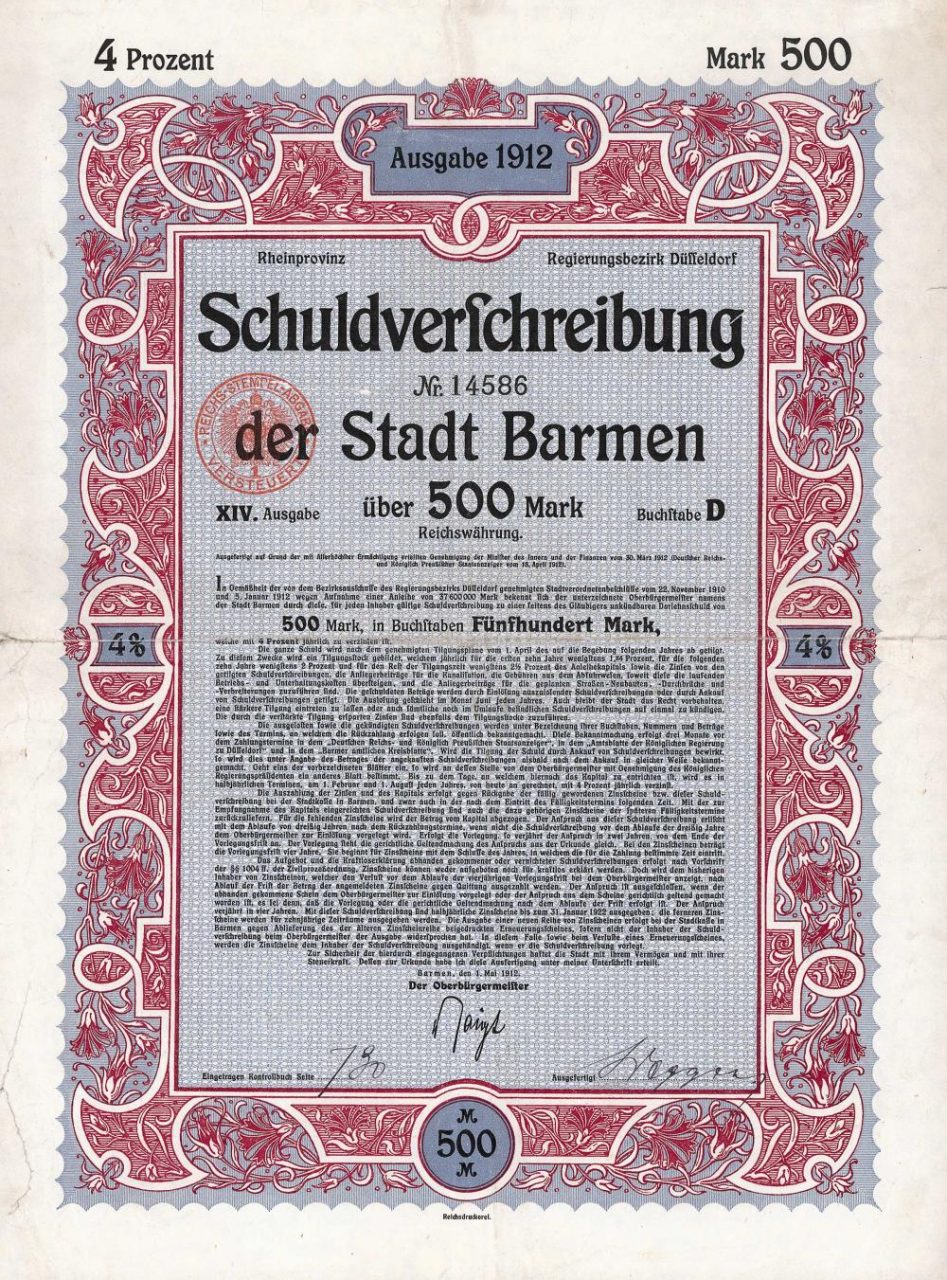 A-64401Stadt Barmen-1Barmen19121 obbligazione 4% da 500 MarchiR4 (251-500 pezzi)S4 (da 101 a 250 €)