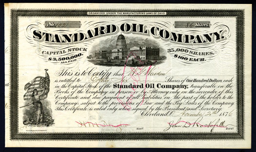 La Standard Oil nacque come una società tra il noto industriale John Davison Rockefeller, suo fratello William Rockefeller, William Flagler, il chimico Samuel Andrews e Stephen V. Arkness. Usando strategie efficaci, ma anche assai criticate, la compagnia assorbì molti dei suoi concorrenti, dapprima a Cleveland, nell’Ohio, poi nel resto del Nordest degli Stati Uniti, facendo così fallire i concorrenti che si rifiutarono di venire assorbiti.