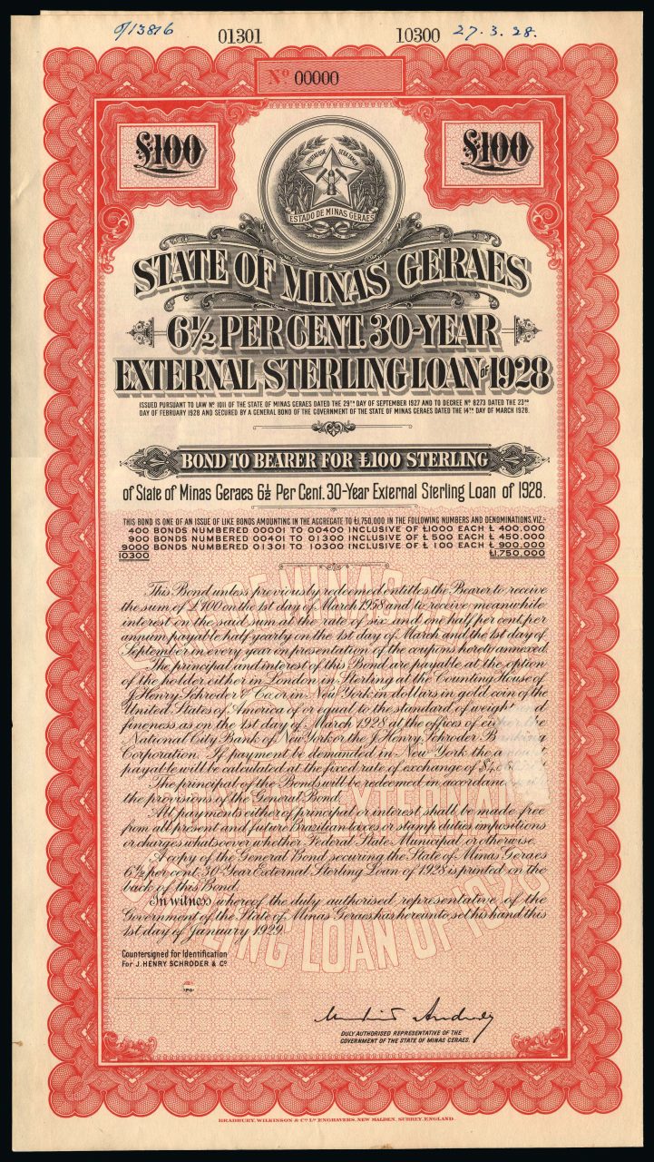 A-33739State of Minas Geraes, 1928, 6½% 30-Year External Sterling Loan-1Brasile1928£100 - RedR2 (1001-5000 pezzi)S3 (da 51 a 100 €)