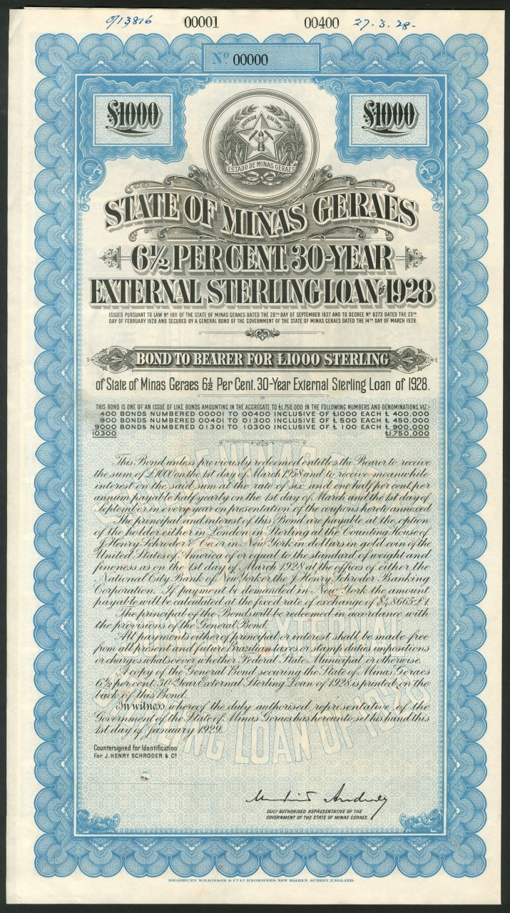 C-33739State of Minas Geraes, 1928, 6½% 30-Year External Sterling Loan-3Brasile1928£1000 - BlueR2 (1001-5000 pezzi)S3 (da 51 a 100 €)