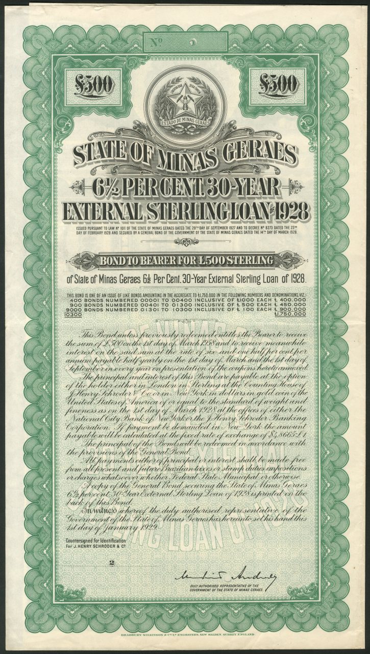 B-33739State of Minas Geraes, 1928, 6½% 30-Year External Sterling Loan-2Brasile1928£500 - Green R2 (1001-5000 pezzi)S3 (da 51 a 100 €)
