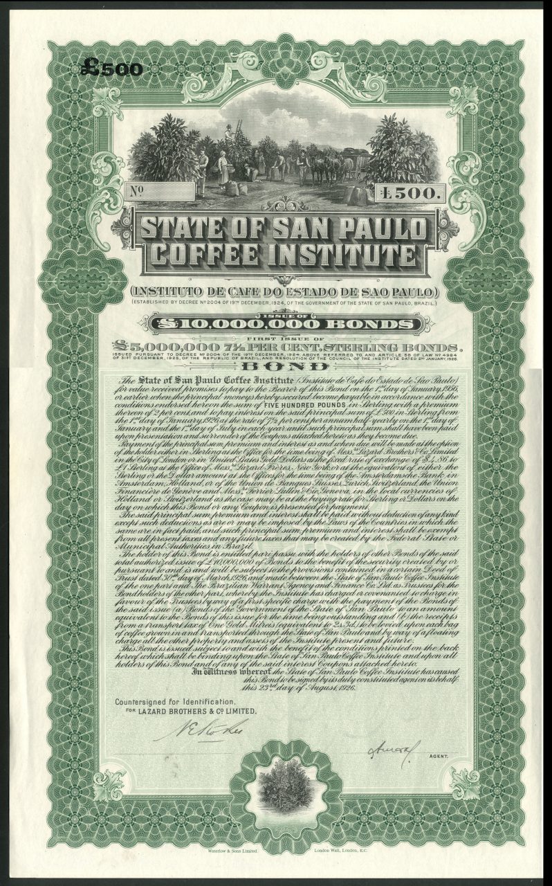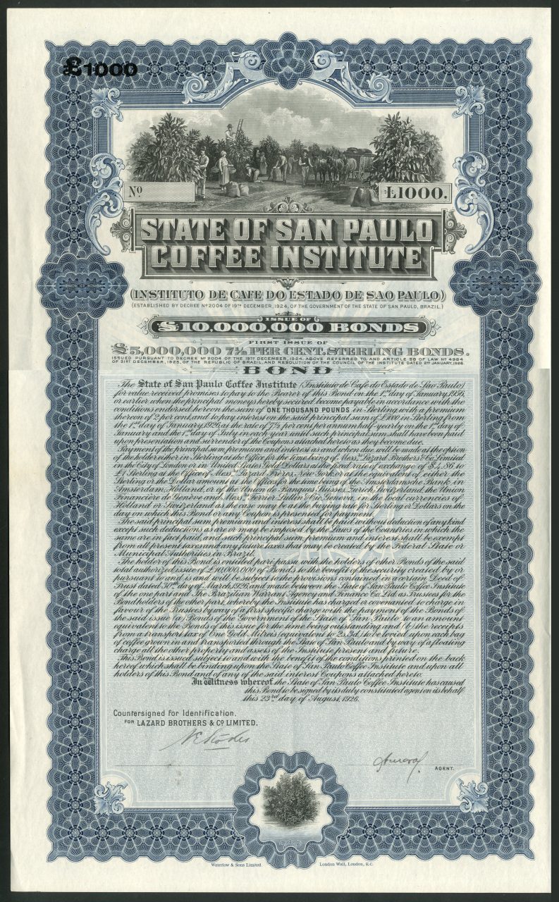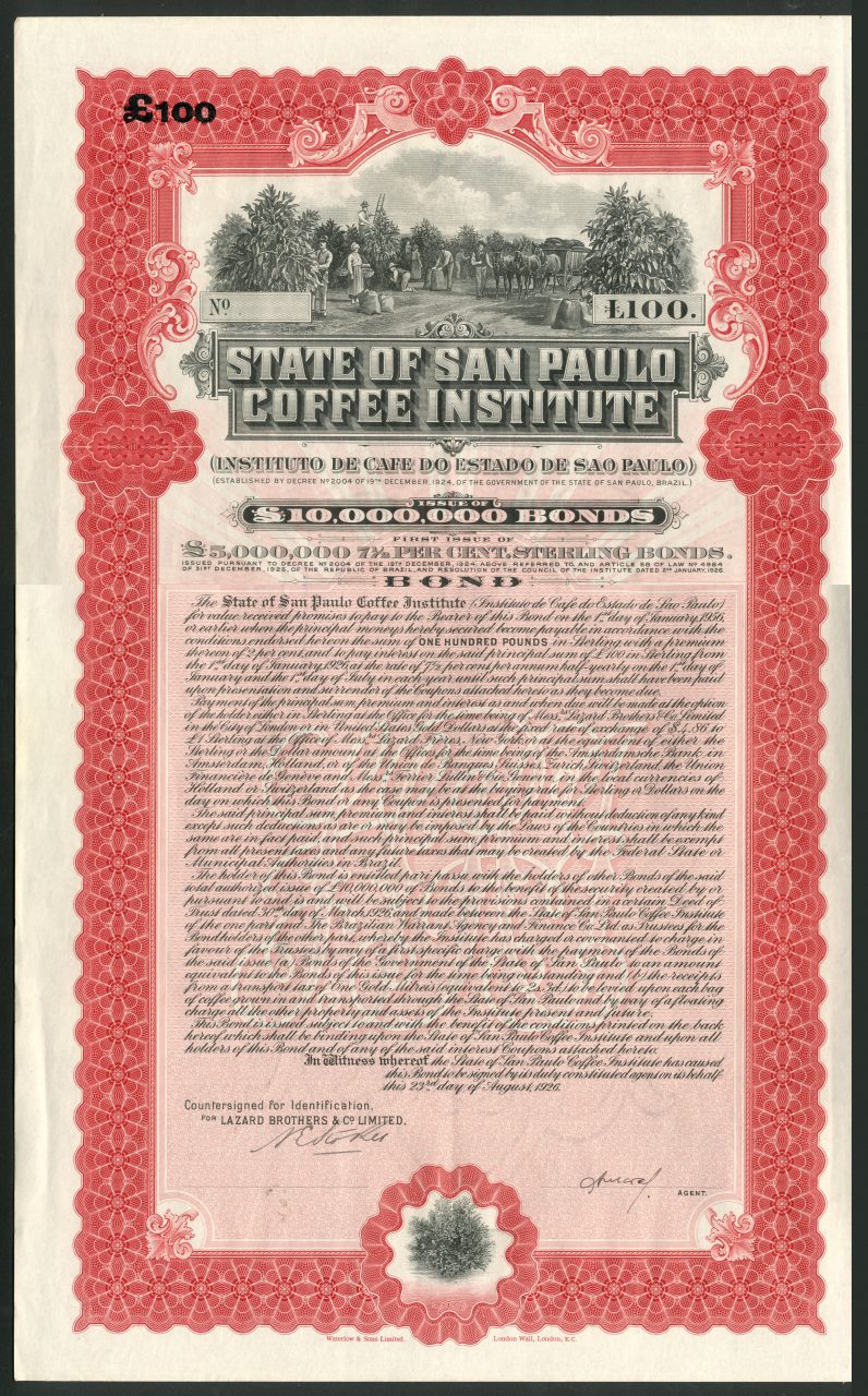 State of San Paulo Coffee Institute, 7½% Sterling Bonds, 1926