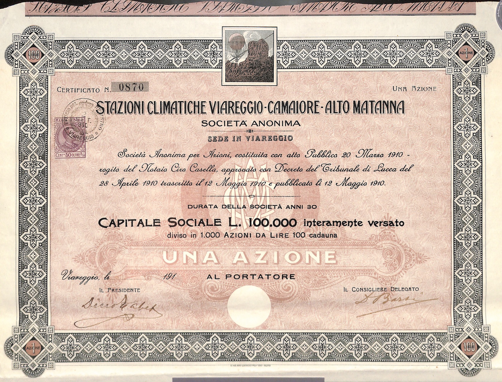 Lo scopo della società fu la costruzione di una funivia che collegasse Viareggio e Camaiore in Versilia con Alto Matanna nelle Alpi Apuane, utilizzando una cabina sostenuta da un pallone aerostatico ben riprodotta nella vignetta del certificato.