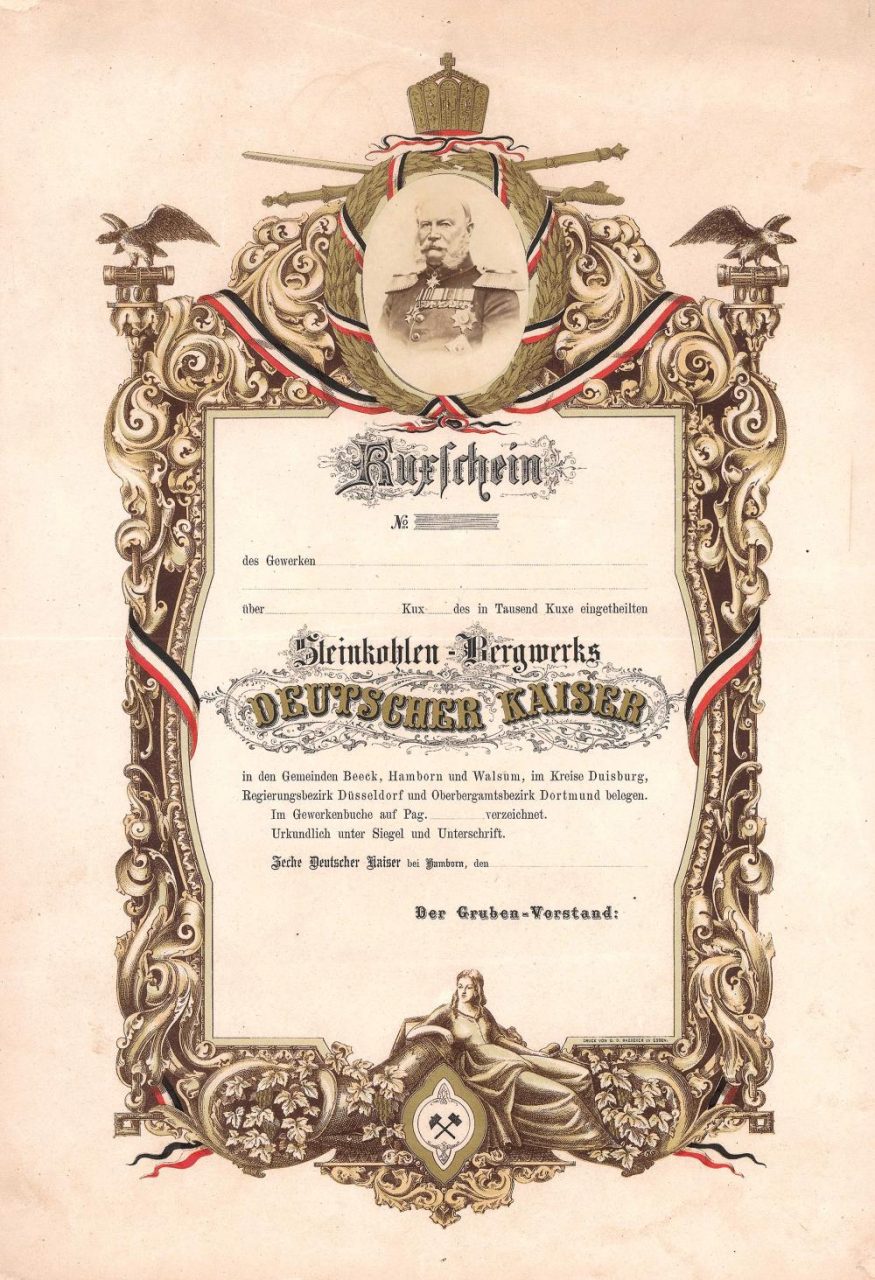 L’Unione degli imperatori tedeschi era emersa nel 1871 dalla trasformazione del sindacato Hamborn, che a sua volta fu fondato nel 1867 dopo il consolidamento dei singoli campi Hamborn I-VIII, che era stato suggerito da Daniel Morian e premiato nel 1859-61. Nel 1871 iniziarono i lavori per affondare il pozzo 1 a nord-ovest della stazione ferroviaria di Neumühl, che iniziò l’attività mineraria nel 1876. Intorno al 1885 il finanziamento annuale fu di ca. 180.000 t. A quel tempo, l’Oberbergamt ha richiesto un secondo albero per motivi di sicurezza. Fu nel 1880/82 che la costruzione di un impianto di lavaggio del carbone e la costruzione del porto di Alsum e della ferrovia di collegamento divorarono ingenti fondi. Alla luce delle nuove esigenze finanziarie, il prezzo di mercato del Deutscher Kaiser Kuxe è fortemente diminuito. Quella era l’ora di August Thyssen: dal 1885, iniziò ad acquistare la Kuxe per creare le proprie imprese dell’industria carboniera in un gruppo integrato verticalmente. Quando il secondo pozzo nel comune di Aldenrade fu affondato nel 1888 (inizio della produzione nel 1896), August Thyssen aveva già la maggioranza di Kuxen e divenne presidente del consiglio di miniera nello stesso anno. Nel 1889, Thyssen fonde i suoi altri campi della Renania, Walsum I-IV e Neu-Düppel con il sindacato Deutscher Kaiser, i cui diritti totali sul carbone erano ora di 34 milioni di metri quadrati. August Thyssen ampliò vigorosamente la società e incorporò grandi impianti industriali di ferro, miniere di minerali e un proprio parco navale, nonché un reparto di costruzione di pozzi. Nel 1897, la prima cokeria del gruppo con 60 forni da coke entrò in funzione sull’albero 3 a Bruckhausen (inizio della produzione nel 1895). All’inizio del secolo, gli ormai 7 alberi di produzione del sindacato Deutscher Kaiser stavano già estraendo più di 1 milione di tonnellate di carbone all’anno, che rapidamente salirono a oltre 2 milioni di tonnellate nel 1906 e 3 milioni di tonnellate nel 1908, per raggiungere la produzione massima di 4,5 milioni di tonnellate nel 1913. Nel 1919 il Gruppo Thyssen fu sostanzialmente riorganizzato. Per tutta la sua vita, August Thyssen rifiutò categoricamente la conversione della sua società in una società per azioni (come Friedrich Krupp, tra l’altro) e finanziò la costituzione del gruppo esclusivamente dalle eccedenze attuali, e rimase tale: l’Unione degli imperatori tedeschi divenne ribattezzata AUGUST THYSSEN- HÜTTE e trasferito nel nuovo sindacato di Friedrich Thyssen. Il 5 maggio 1926, il gruppo Thyssen portò tutte le sue operazioni di estrazione nella nuova Vereinigte Stahlwerke AG, la cui fondazione ebbe un ruolo importante in August Thyssen. Non visse per vedere questo giorno per poco: il 4 aprile 1926, August Thyssen morì nel suo castello Landsberg vicino a Essen-Kettwig. Suo figlio Fritz Thyssen è diventato il presidente del consiglio di sorveglianza del gigante, in cui Thyssen aveva una partecipazione del 26%. Dopo la separazione della Vereinigte Stahlwerke, August Thyssen-Hütte AG fu fondata il 2 maggio 1953, che è ancora la più potente società tedesca nel suo settore dopo la fusione con Krupp-Hoesch.