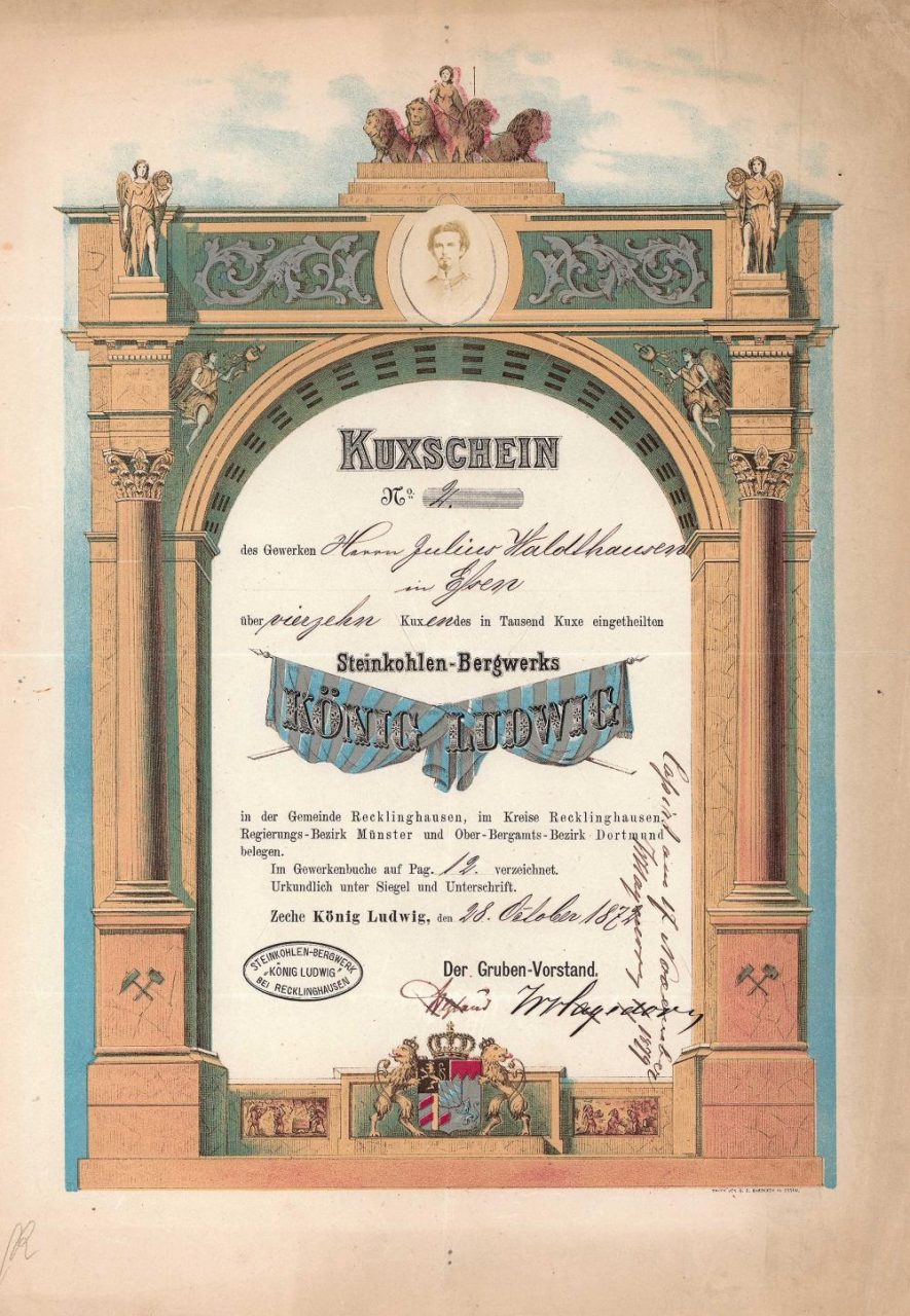 L’unione del re Ludwig (fondata il 12 marzo 1872 da Friedrich Funke, Friedrich Grillo, Wilhelm Hagedorn ed Ewald Hilger) risale alla miniera di carbone di Ver. Henriettenglück, creato dai consolidati campi minati Henriettenglück I, II e III. L’affondamento di Shaft ho iniziato nell’anno della sua fondazione. Dopo diverse interruzioni nel lavoro di affondamento a causa della difficile gestione degli afflussi d’acqua, la produzione iniziò nel 1885. L’albero II fu affondato nel 1889, e ricevette finanziamenti nel 1892 e nel 1889 fu messa in funzione una propria cokeria. Il 1898 fu un anno significativo: la proprietà dei campi da parte del sindacato del re Ludwig quadruplicò attraverso l’acquisizione dei campi distintivi del principe Federico Carlo I del sindacato di Henrichenburg. Nel 1899 fu aperto un porto separato sul canale Dortmund-Ems. Dal novembre 1912, anche la città di Recklinghausen è stata rifornita di luce e gas. Nel 1925 l’antica miniera di ver. Trappe acquisì a Silschede, che era stata in grande fioritura fino agli anni 1870. Nel 1931 fu avviata una joint venture con il sindacato Ewald, che culminò con la fondazione della società mineraria Ewald-König Ludwig nel 1935. L’unione del re Ludovico fu successivamente liquidata. La nuova AG fondata entrò in possesso della Reichswerke AG Hermann Göring nel 1941. Nel 1956 fu concluso un accordo collettivo con quella che in seguito divenne la AG per le società minerarie e di fusione (oggi finalmente Salzgitter AG). Quell’anno, Ewald-König Ludwig (compresa la Haus Aden) è stata una delle più grandi miniere della Ruhr con una produzione di 6 milioni di tonnellate di carbone. A metà del 1965, la miniera “Re Ludwig” cessò la produzione dopo che non era più economicamente sostenibile a causa dei depositi geologicamente pericolosi. Gli ultimi 2.500 dipendenti sono stati in gran parte distribuiti ad altre miniere di carbone Ewald.