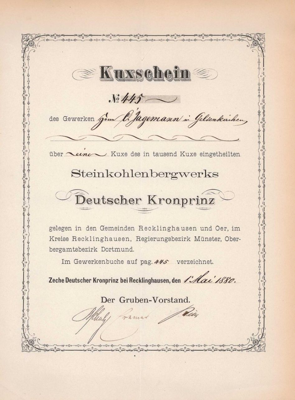 Franz Haniel affondò il primo pozzo del principe ereditario. Supportato nel 1839, ma già chiuso nel 1842 a causa di gravi difficoltà nel drenaggio dell’acqua e nella gestione meteorologica, il campo rimase incompiuto. Il calcolo includeva 2 campi normali con una dimensione di 4.378.000 mq. Tra le altre cose, inclusa la miniera August Thyssen. Nel 1900, la società mineraria Hibernia rilevò 380 Kuxe in cambio di 133 azioni proprie e nel 1904 questo gruppo minerario, che in seguito era di proprietà della maggioranza dello stato prussiano, acquisì una maggioranza di tre quarti dopo ulteriori acquisizioni.