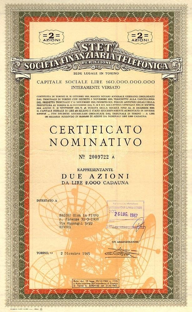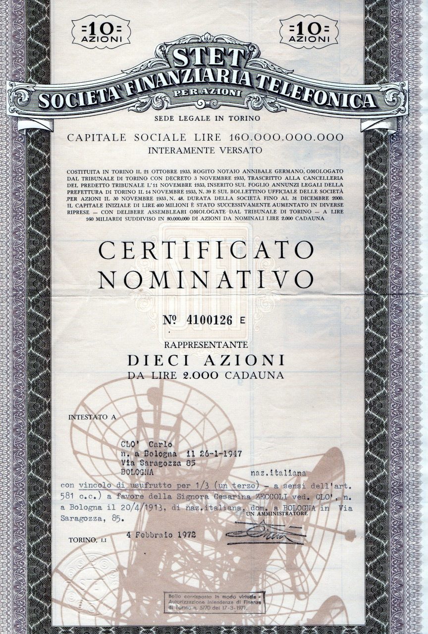 Antenne paraboliche sullo sfondo. Il titolo fu stampato dalla nota Officina carte valori Staderini di Roma. L’azienda venne creata dall’IRI nel 1933 per controllare alcune società concessionarie di servizi telefonici. Nello stesso anno la SIP – Società idroelettrica piemontese che controllava Stipel, Telve e Timo, coinvolta nel crollo di Italgas e di Banca Commerciale Italiana fu salvata dall’IRI proprio tramite STET. Negli anni Sessanta la STET, divenuta un gigante, controllava aziende come SIP, Selenia, Sistel, Italtel e Stet International, tramite cui era attiva anche in Grecia (Stet Hellas), Brasile (Brasil Telecom) e Spagna (Retevision). Nel 1992, con la politica delle privatizzazioni, fu trasformata in STET – Società finanziaria telefonica SpA e vide espandere il suo business all’editoria, alla pubblicità e all’informatica. L’anno dopo fondò Stream, una delle più importanti pay TV digitali e satellitari italiane. La fusione tra STET e Telecom Italia, avvenuta nel 1997, diede origine a Telecom Italia SpA.