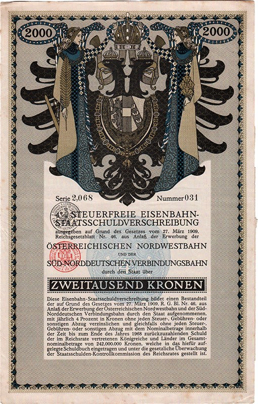 Imponente e suggestivo stemma imperiale asburgico con aquila bicipite ad ali spiegate. Il prestito fu contratto per finanziare la costruzione della ferrovia austriaca nord-ovest (nordwestbahn) ed il collegamento alla rete sud-nord tedesca (süd-norddeutschen verbindungsbahn).