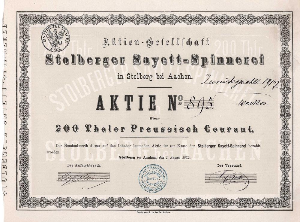 AG dal 1872. La società risale alla filanda per tessitura del cotone costruita da Grand’Ry da Verviers e P. Poswick nel 1832, che fu chiamata A.J. de Grand’Ry, il precursore della filanda Sayett sull’Ellermühle, che in seguito si trovava a nord-ovest del Bastinsweiher. Sayett era il vecchio termine renano per filati di lana per maglieria. Lo stagno di Bastin serviva da serbatoio, ma l’acqua calcarea di Vichtbach causava alcune difficoltà nella produzione. Adolf Bastin divenne il direttore della fabbrica nel 1870 e i suoi figli continuarono a gestire l’attività fino alla prima guerra mondiale. Nel 1916 la società fu sciolta. Successivamente, l’azienda tessile di Magdeburgo E. Kümmerlé ha continuato l’operazione con scarso successo. Nel 1925 la città di Stolberg acquistò gli edifici e nel 1928 la società uscì.