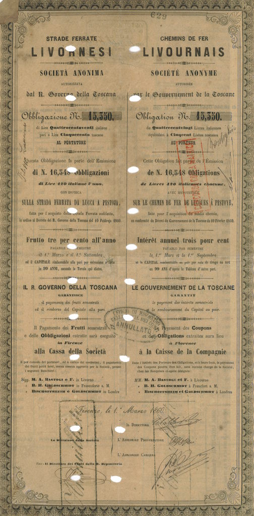 La Società fu costituita nel 1860 e assorbita dalla ” Società Strade Ferrate Romane” nel 1865. I titoli sono stati emessi in 5 serie: A, B, C, D1 e D2 negli anni 1860, 1862 e 1864. L’emissione fu autorizzata con Decreti del Governo Provvisorio della Toscana per le prime 3 serie e del Governo del Regno d’Italia per le altre due, onde fornire alla Società i mezzi necessari per l’acquisto, la costruzione e il completamento di linee ferroviarie. Il debito venne assunto a carico dello stato con decorrenza dal 1° Gennaio 1882.