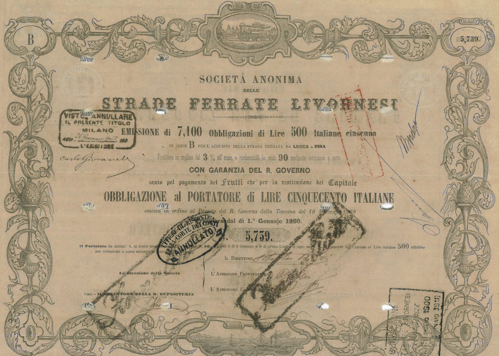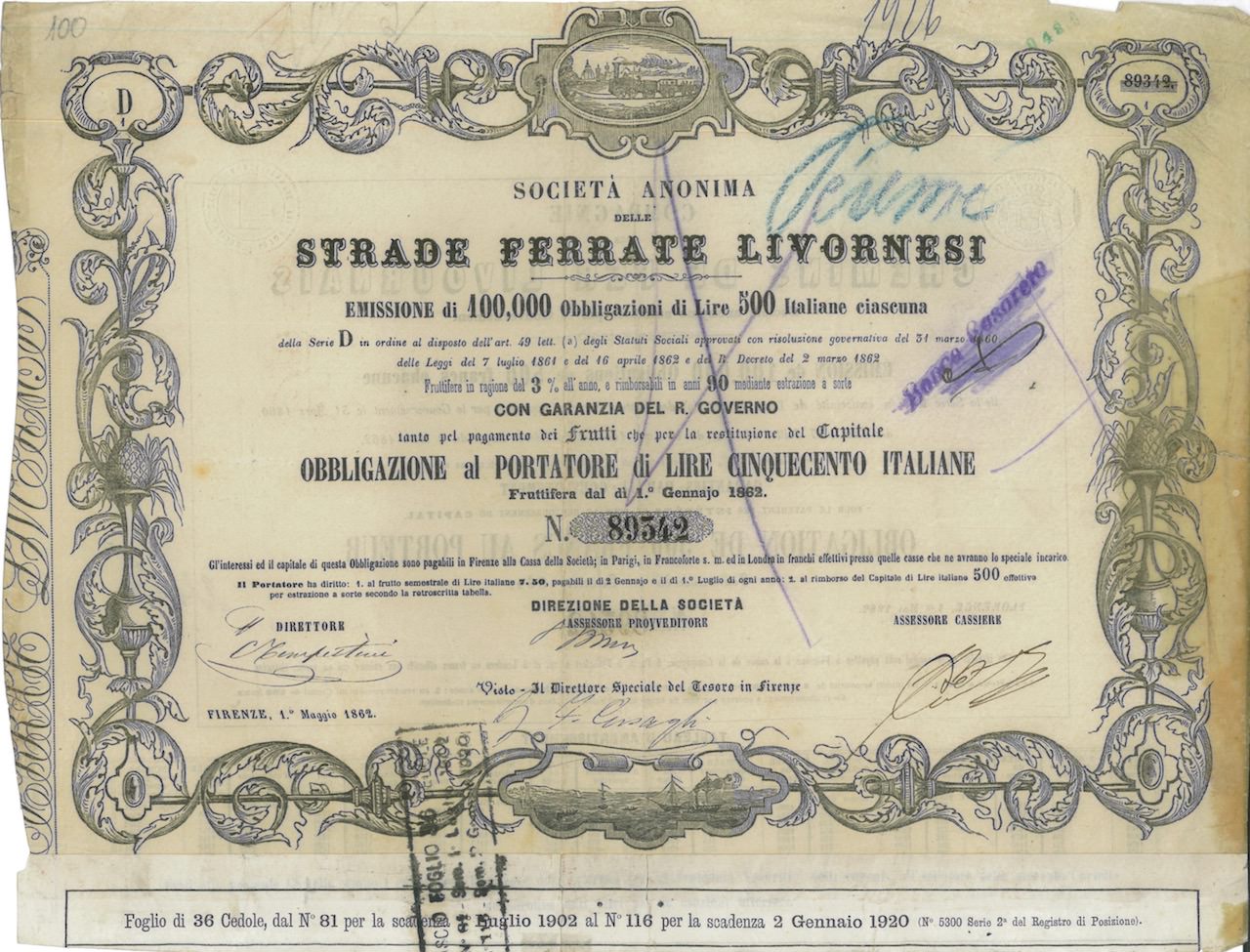 La Società fu costituita nel 1860 e assorbita dalla ” Società Strade Ferrate Romane” nel 1865. I titoli sono stati emessi in 5 serie: A, B, C, D1 e D2 negli anni 1860, 1862 e 1864. L’emissione fu autorizzata con Decreti del Governo Provvisorio della Toscana per le prime 3 serie e del Governo del Regno d’Italia per le altre due, onde fornire alla Società i mezzi necessari per l’acquisto, la costruzione e il completamento di linee ferroviarie. Il debito venne assunto a carico dello stato con decorrenza dal 1° Gennaio 1882.