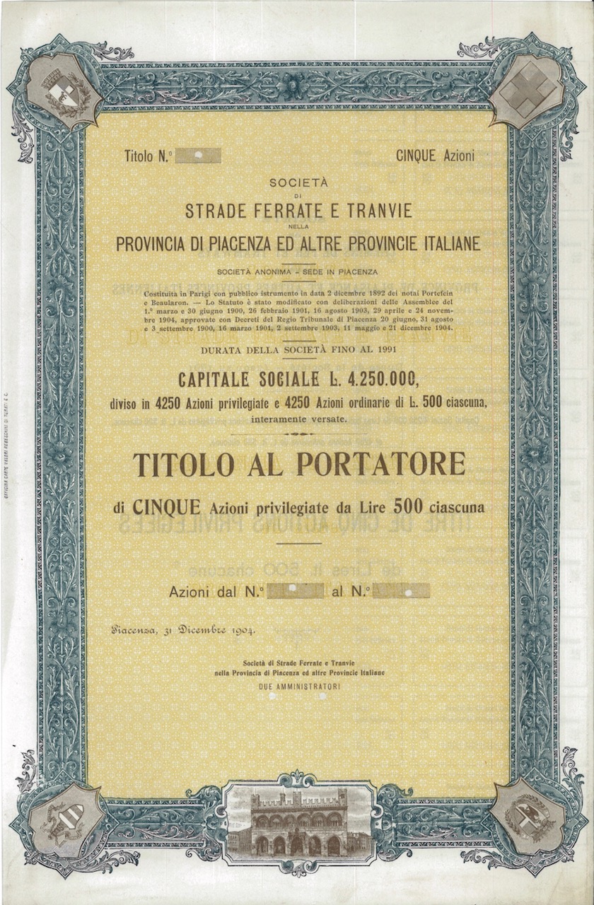 A-9983Strade Ferrate e Tranvie nella Pr. di Piacenza ed altre Pr. It. S. di-1Officina Carte Valori Rebeschini di Turati e C. - MilanoPiacenza19045 azioniR5 (101-250 pezzi)S4 (da 101 a 250 €)