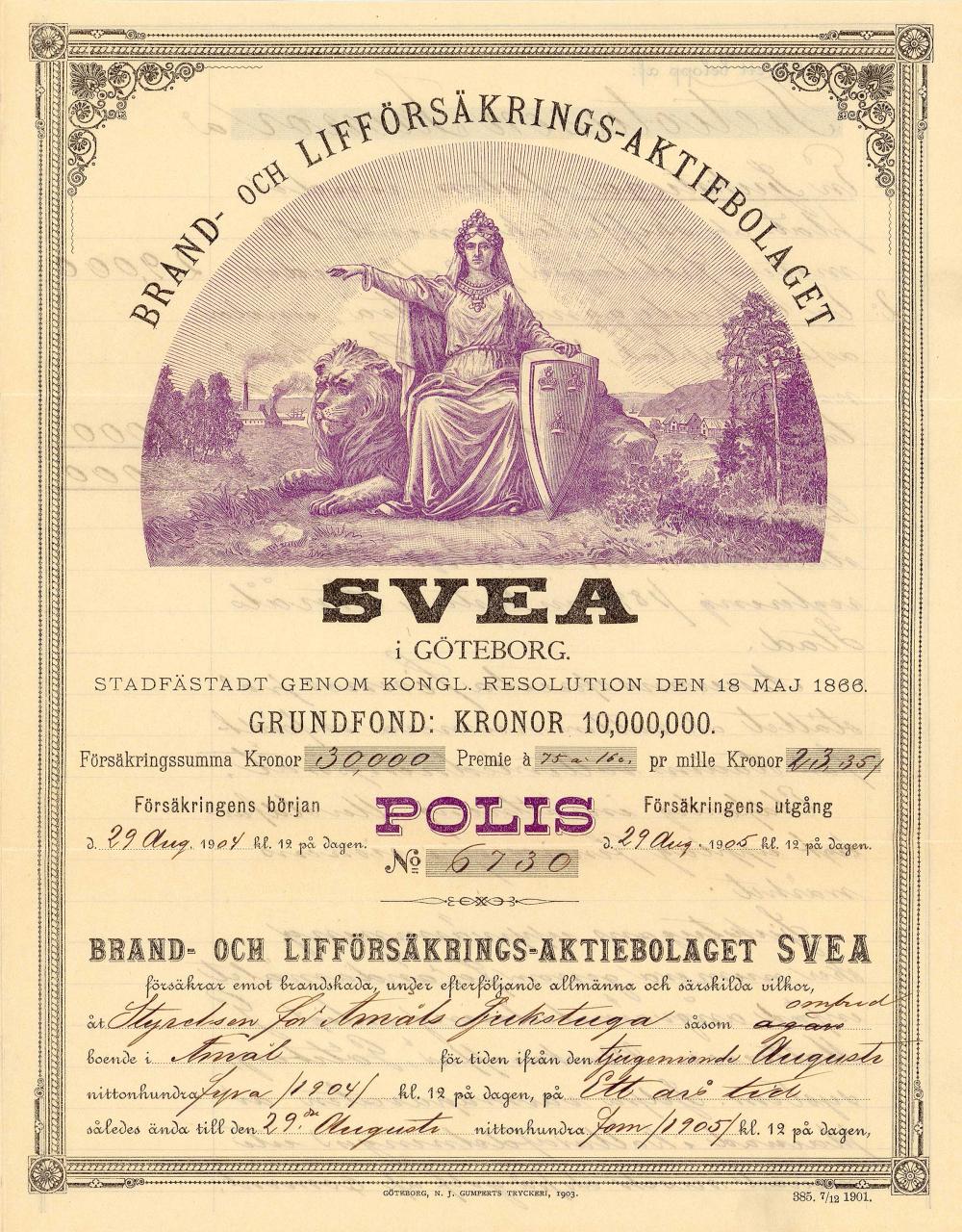 Assicurazione incendio e vita fondata nel 1866. Svea è la forma abbreviata di Svearike = Regno di Svezia.