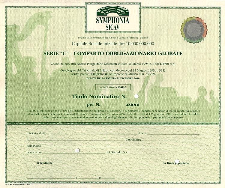 Nota società di fondi comuni di investimento. Simbolica immagine di un'orchestra sinfonica sullo sfondo.