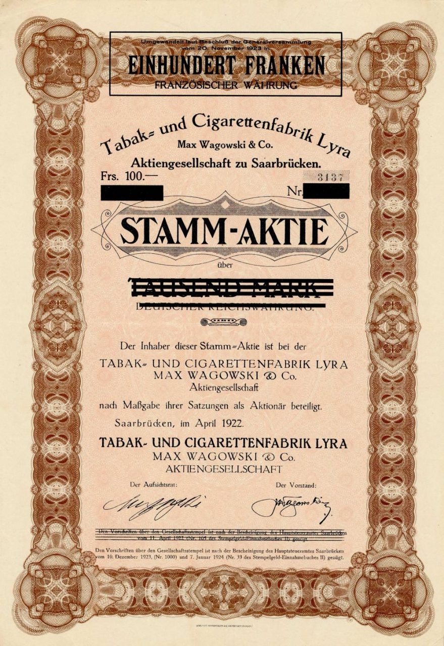 Fondata nel 1921/22 per continuare la società con lo stesso nome che era precedentemente esistita come società in accomandita semplice a Saarbrücken, Hohenzollernstr. 33. A Echternach, in Lussemburgo, nel 1924 fu aperta una filiale nei locali di un’ex conceria sotto la società “Fabrique luxembourgeoise de cigarettes, cigares et tabacs Lyra S.A.”. Nel 1929 viene fondata a Saarbrücken con lo stesso indirizzo di “Lyra Co. Cigarettenmanufaktur AG”. Il Ges. Fu sciolta nel 1931.