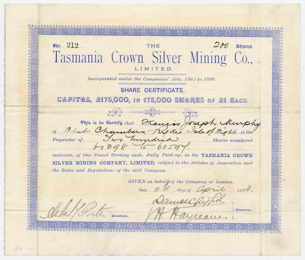 A-33298Tasmania Crown Silver Mining Company Ltd-1Tasmania1893200 SharesR2 (1001-5000 pezzi)S2 (da 26 a 50 €)