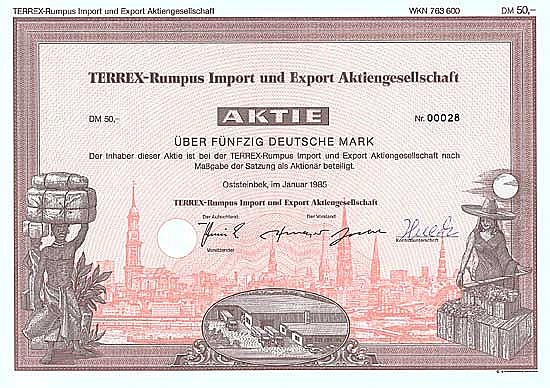 Fondata nel 1923 come “Vereinigte Rumpuswerke AG” dalla fusione delle società Bönnhoff, Rumpus & Co. (fondata nel 1913), J. Frank & Sohn GmbH (entrambe a Mönchengladbach, filatura e tessitura del cotone, finissaggio, sbiancamento e tintura) e Hoster & Sohn GmbH, Waldniel (tessitura di lino e mezzo lino). Nel 1932 anche acquisizione di Spinnindustrie AG vorm. Mühlen & Peltzer, Rheydt-Giesenkirchen (filatura bicilindrica e Vigognes). Negli anni 1971-80 graduale chiusura di tutte le aziende tessili. Nel 1984 riattivazione della giacca di borsa e cambio di nome come sopra, contemporaneamente la sede viene trasferita ad Amburgo-Oststeinbek. Nel 1985 partecipazione al M.A.C. Textil-GmbH ad Amburgo e acquisizione della Alexander Lisch GmbH a Oststeinbek (souvenir, articoli per souvenir e fiori di seta), nel 1987 acquisizione della Löwen-Teppichhaus GmbH a Braunschweig (dalla Braunschweigische AG per l’industria della iuta e del lino). Nel 1988 fondazione della Cito Werk Zweirad und Freizeitartikel GmbH a Garrel. La diversificazione fallì, nel 1993 il nome fu cambiato in TERREX Handels-AG e si concentrò sull’importazione, esportazione e vendita all’ingrosso di articoli da regalo. Più di recente, lo scopo aziendale dichiarato era “Acquisizione e gestione di terreni e fabbricati, nonché riparazione di edifici, in particolare lavori su tetti e impianti idraulici” – una storia aziendale davvero colorata che si è conclusa in bancarotta nel 2009.