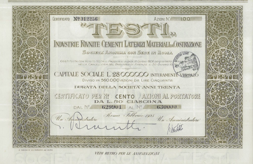 C-4472Testi – Industrie Riunite Cementi Laterizi Materiali da Costruzione S.A.-3E. Tarchetti - RomaRoma1925100 azioni al portatore da Lire 50R1 (Più di 5000 pezzi)S1 (da 0 a 25 €)