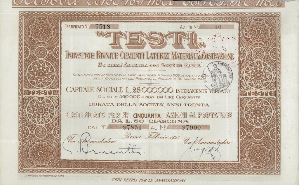 B-4472Testi – Industrie Riunite Cementi Laterizi Materiali da Costruzione S.A.-2E. Tarchetti - RomaRoma192550 azioni al portatore da Lire 50R1 (Più di 5000 pezzi)S1 (da 0 a 25 €)