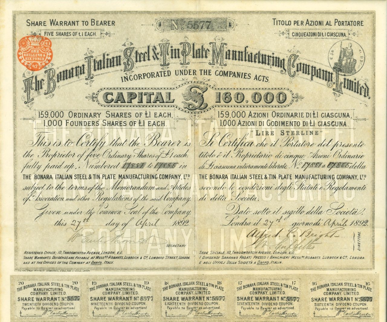 I certificati della The Bonara Italian Steel & Tin Plate Manufacturing Company, Ltd. rappresentano un interessante esempio di titolo storico, con un forte valore collezionistico per gli appassionati di scripofilia. La sua emissione riflette il dinamismo industriale del tardo XIX secolo e la collaborazione tra capitale britannico e industria italiana.
