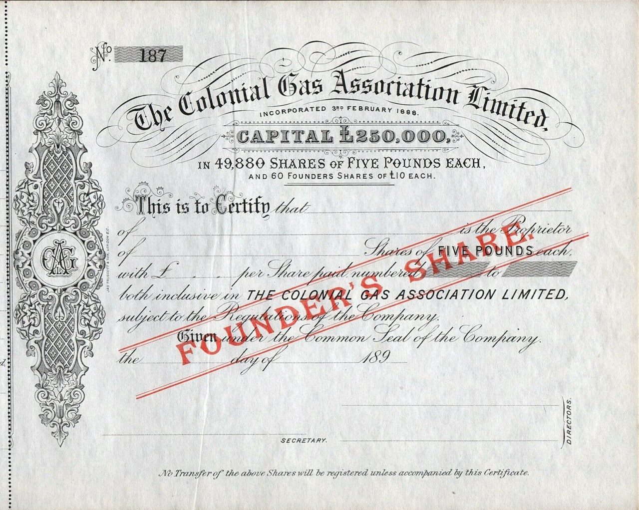 Was incorporated on 3rd February 1888, with a nominal capital of £250,000 made up of 49,880 £5 shares, and 60 Founders Shares of £10 each. Printed by Jas Truscott & Son, London.