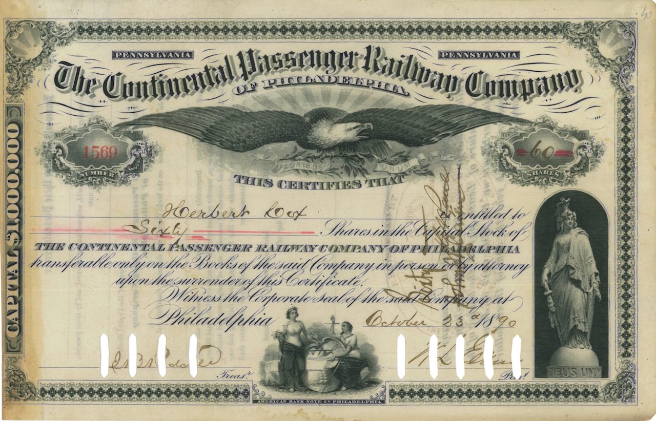 A-26341The Continental Passenger Railway Company-1American Bank Note Company - New YorkPhiladelphia1890VariabileR3 (501-1000 pezzi)S3 (da 51 a 100 €)
