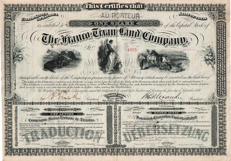 Testo in inglese, francese e tedesco. Vignette con bovini al pascolo e contadini intenti alla mietitura, al centro figura femminile simbolica. La compagnia franco-texana fu costituita nel 1876 prevalentemente dagli obbligazionisti francesi della vacillante Memphis, El Paso and Pacific Rairoad, nel tentativo di salvare il loro investimento mediante l’acquisto, l’affitto e la vendita di terreni in Texas. Fu liquidata nel 1896.