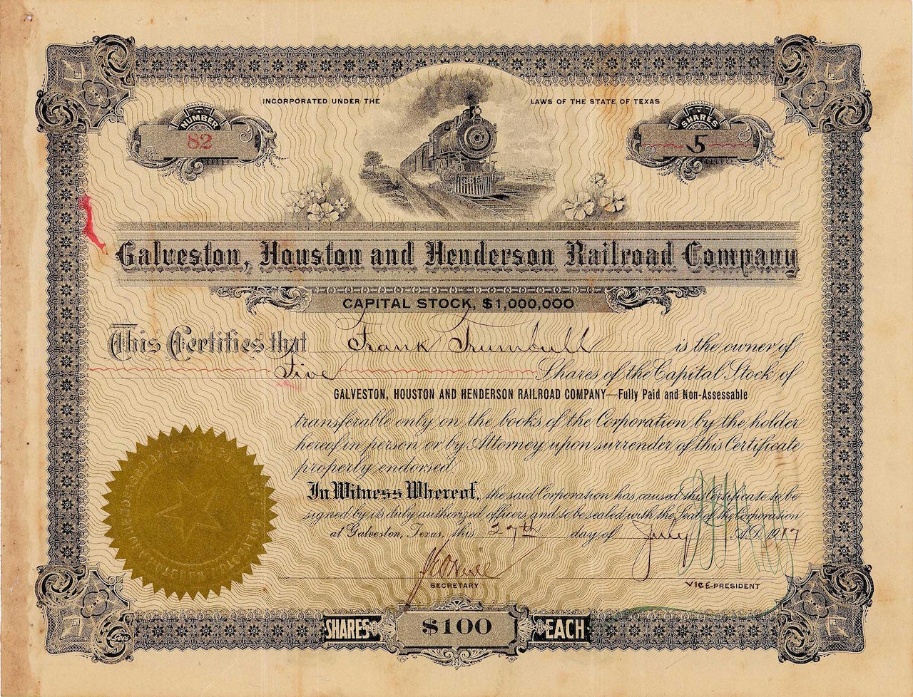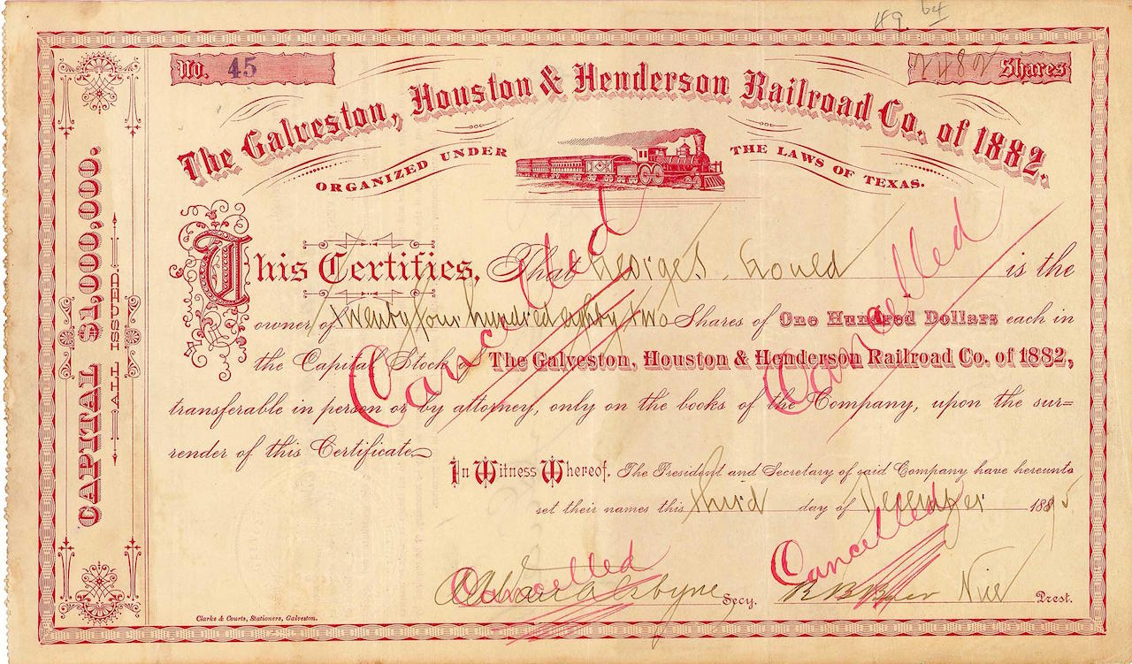 Fondata nel 1853 per costruire il treno di 50 miglia da Willow Street a Houston, Tx. via Virginia Point e Island Causeway fino alla 33rd Street a Galveston. Una breve linea di collegamento collega la 33a alla 35a strada con le stazioni Gulf, Colorado e Santa Fe Ry. Inaugurato già nel 1854. Soprattutto fu coinvolta la capitale europea (oltre alla sede amministrativa di New York, 49 Wall Street, la compagnia ferroviaria mantenne anche un’altra amministrazione a Parigi). Nel 1871, 1880 e 1882, la ferrovia fallì tre volte di seguito e fu ripetutamente riorganizzata con lo stesso nome. Alla fine, nel 1895, George J. Gould rilevò il suo Missouri, Kansas e Texas Ry. e il Missouri Pacific. Il fatto che la ferrovia esista ancora oggi è probabilmente la ragione della domanda speculativa sempre crescente per i suoi vecchi titoli a partire dalla metà del 19 ° secolo, perché la legge sul debito degli Stati Uniti non ha periodi di limitazione.