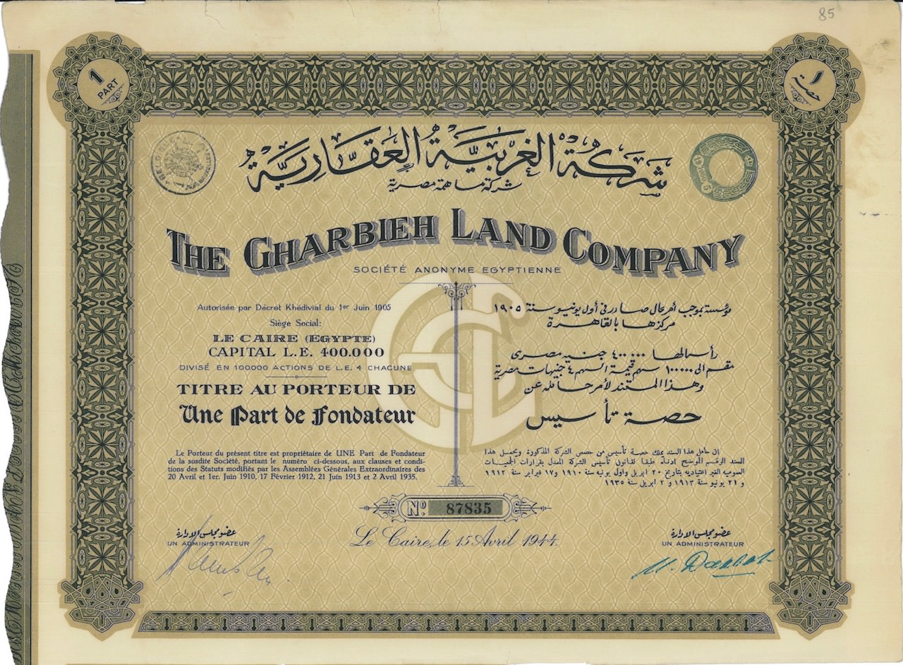 B-27502The Gharbieh Land Company-2N.D.Il Cairo19441 azione di fondazioneR2 (1001-5000 pezzi)S1 (da 0 a 25 €)