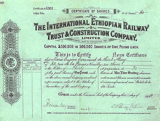 Fondata nel 1901 per conto di investitori francesi e inglesi (“New Africa Co.”) come holding per l’importante Compagnia Ferroviaria Imperiale dell’Etiopia (Cie. Impériale des C.d.F. Ethiopia).