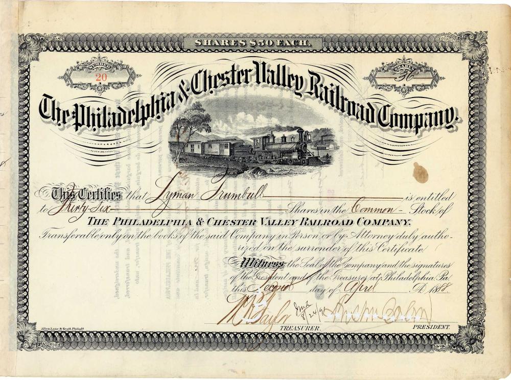 Fondata nel 1888 come successore della Chester Valley RR, la maggior parte delle quali era stata acquistata da un uomo di paglia dalla Pennsylvania RR nel 1887. Il C.V.RR. era già emerso nel 1850 come successore della licenza Norristown & Valley Ry. del 1835, che aveva fallito a causa del progetto. Nel 1853 fu aperta la linea Downingtown-King of Prussia-Norristown, la direzione fu inizialmente alla RR di Filadelfia, Germantown e Norristown e nel 1858 andò alla Filadelfia e alla RR. Sbarcò nel sistema RR della Pennsylvania nel 1887/88. Un’estensione a Trenton ha comportato l’accorciamento della RR della Pennsylvania di 25 miglia per i suoi treni diretti a ovest da New York. Questo cut-off Trenton RR della Pennsylvania è entrato in funzione nel 1892 ed è ancora usato oggi, sebbene ridotto a un solo binario.