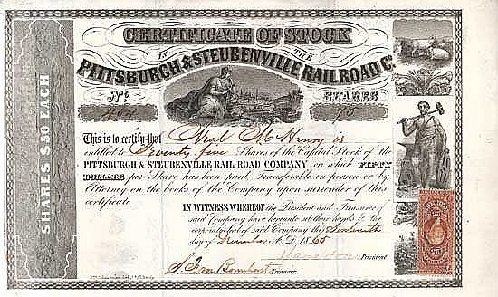La società con licenza nel 1849 gestiva la ferrovia da Pittsburg, Pa. A Steubenville, Ohio, lunga 43 miglia. Operazioni ferroviarie dal 1858. Il 1 maggio 1868, la compagnia si fuse con Holliday’s Cove RR of Virginia (fondata nel 1850) e Steubenville e Indiana RR, Ohio (fondata nel 1848) per formare Pittsburg, Cincinnati e St. Louis Railway con una rete di 200 rotte , 9 miglia. Il Cork Run Tunnel, uno dei 9 tunnel originali che ha costruito, ricorda il Pittsburgh & Steubenville RR.