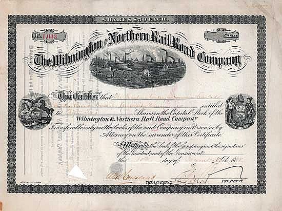 Fondata nel 1866 come Wilmington & Reading RR per costruire la Wilmington 64 miglia, Del. a Birdsboro, Pennsylvania. Anche la famiglia di produttori chimici e di polveri duPont ha svolto un ruolo importante in questa compagnia ferroviaria, la cui linea ha superato il suo mulino per polveri. Durante la riorganizzazione nel 1876 come "Wilmington & Northern RR", i duPont alla fine presero il controllo della maggioranza delle azioni. La società esistette per un intero secolo (in seguito con Reading Co. come principale azionista) prima di entrare a far parte di ConRail nel 1976. Oggi non è più operativa.