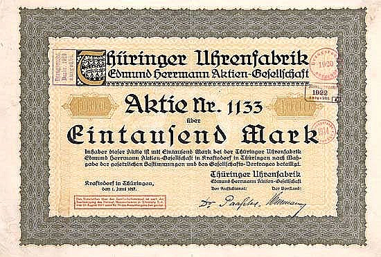 A-72366Thüringer Uhrenfabrik Edmund Herrmann AG-1Kraftsdorf in Thüringen19171 azione da 1.000 Marchi--