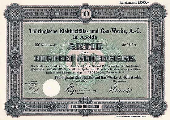 A-68336Thüringische Elektrizitäts-und Gas-Werke AG-1Apolda19281 azione da 100 Marchi--