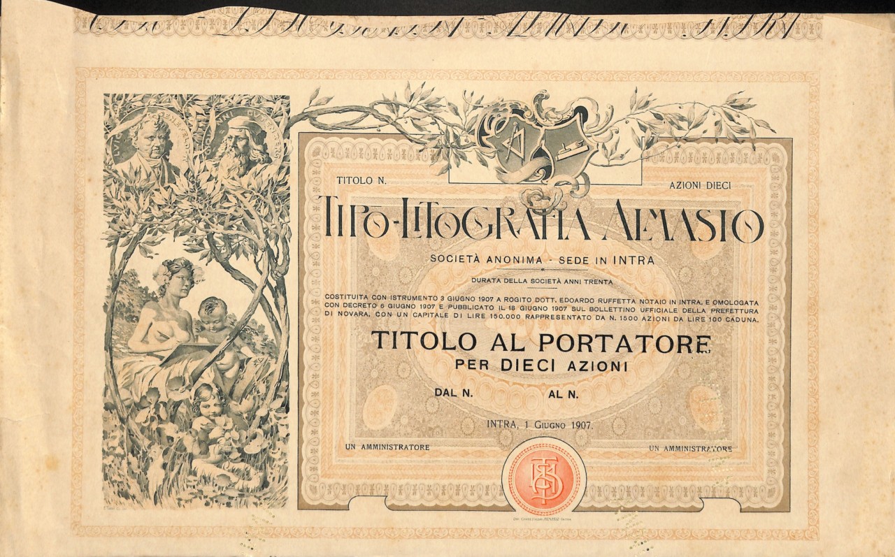 Superba grafica, opera del disegnatore F. Tami: strumenti tipografici, figura femminile simbolica con fanciulli nell’atto di disegnare, effigi dei due celebri inventori del settore tipografico – Senefelder per la litografia e Gutenberg per la stampa a caratteri mobili.