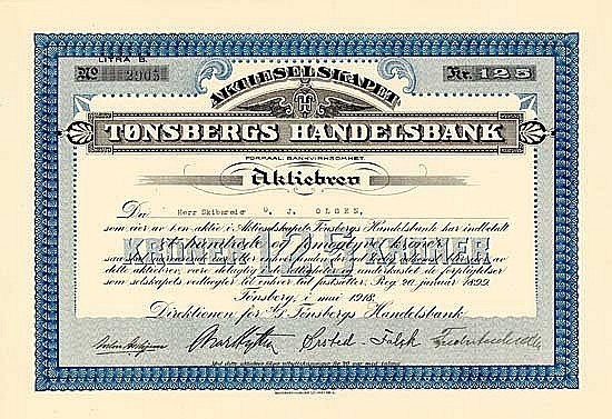 La Handelsbank von Tönsberg è stata fondata nel 1899 con un capitale di 1 milione di Corone. Tönsberg è la città più antica della Norvegia, che, grazie alla navigazione e alla caccia alle balene, ha acquisito grande importanza.